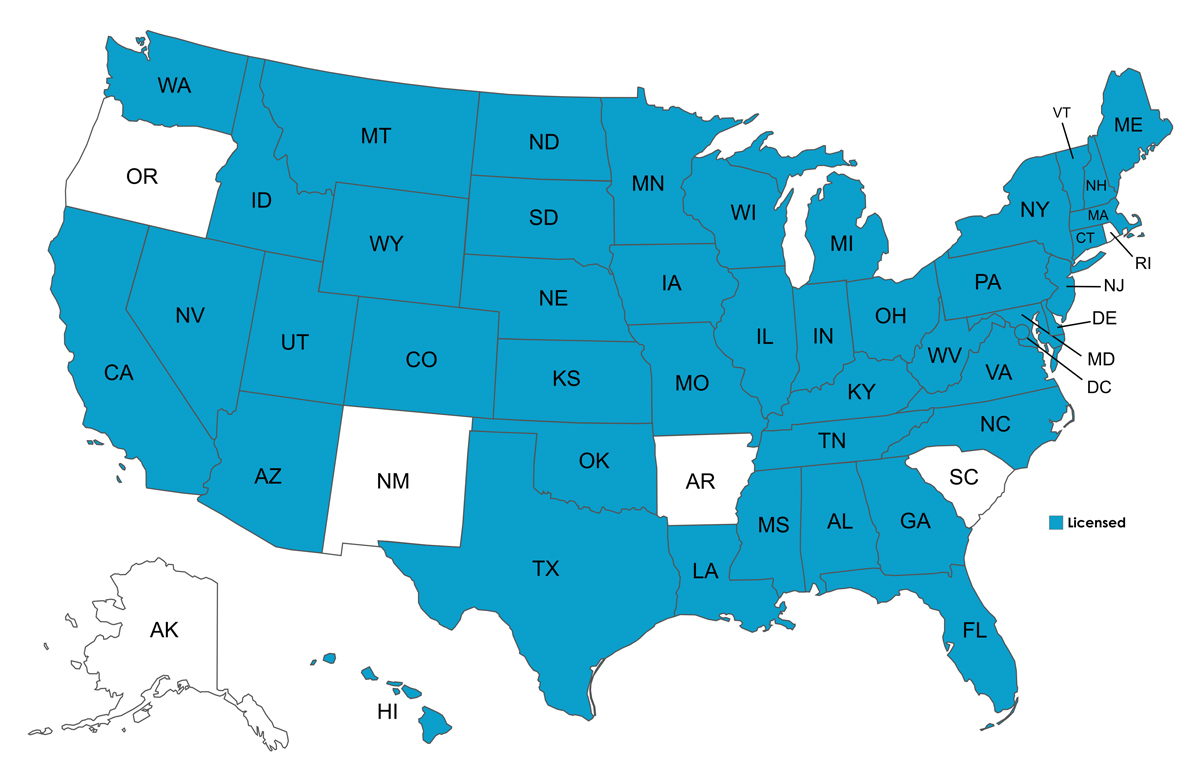 Alabama, Arizona, California, Colorado, Connecticut, Delaware, District of Columbia (DC), Florida, Georgia, Hawaii, Idaho, Illinois, Indiana, Iowa, Kansas, Kentucky, Louisiana, Maine, Maryland, Michigan, Minnesota, Mississippi, Missouri, Montana, Nebraska, Nevada, New Hampshire, New Jersey, New York, North Carolina, North Dakota, Ohio, Oklahoma, South Dakota, Tennessee, Texas, Utah, Vermont, Virginia, Washington, Washington DC, West Virginia, Wisconsin, Pennsylvania, and Wyoming.